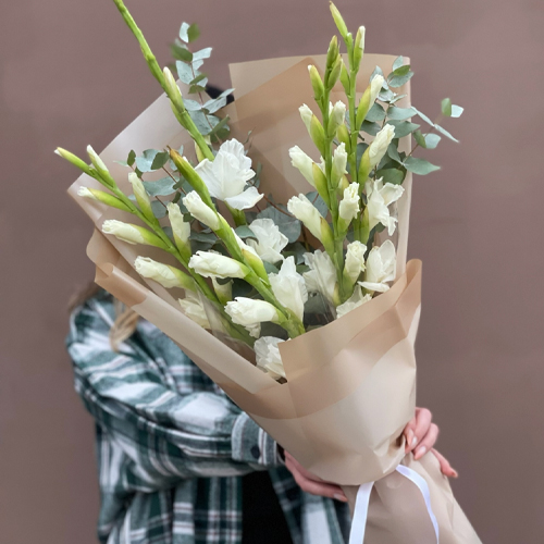 Букет из 5 белых гладиолусов и эвкалипта